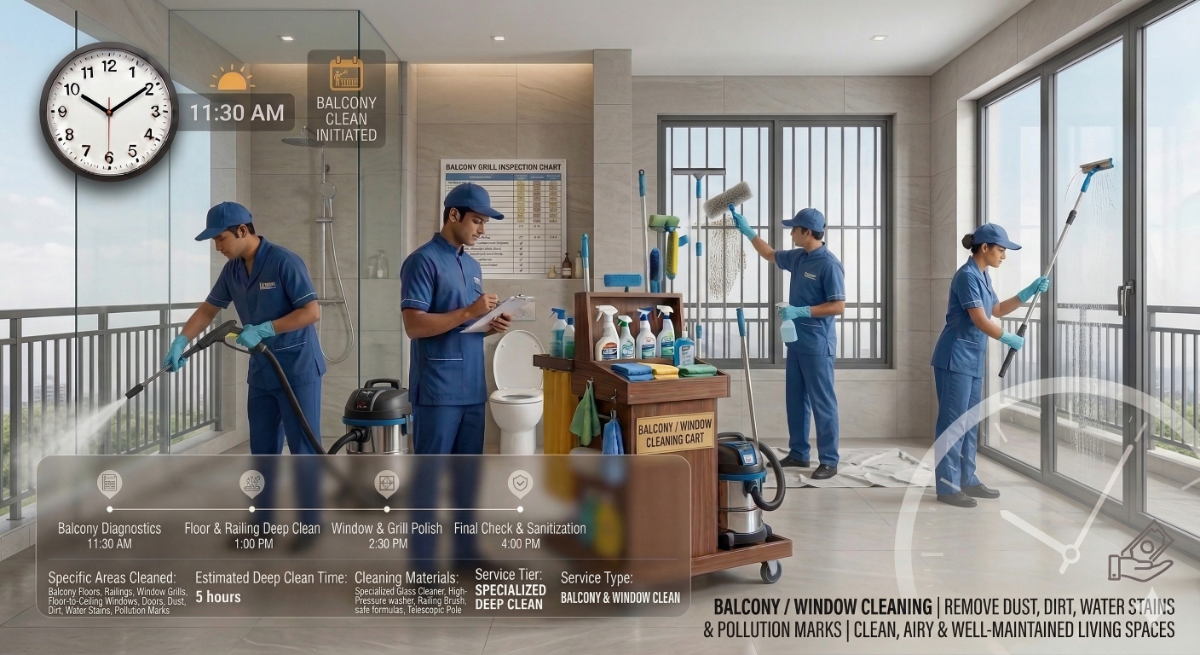 Our Balcony / Window Cleaning service ensures thorough cleaning of balcony floors, railings, grills, and windows to remove dust, dirt, water stains, and pollution marks. We help restore cleanliness and brightness, making your living spaces look fresh, airy, and well-maintained.