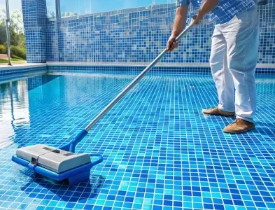 - Intensive scrubbing of pool walls, tiles, and floors to remove calcium scale and algae